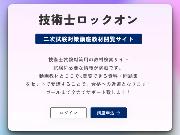 技術士ロックオン教材サイトは、技術士二次試験合格を目指す皆さまのための専門学習プラットフォームです。書類作成のポイント、過去問題、参考資料などが体系的に整理されており、初心者の方でも安心してご利用いただけます。